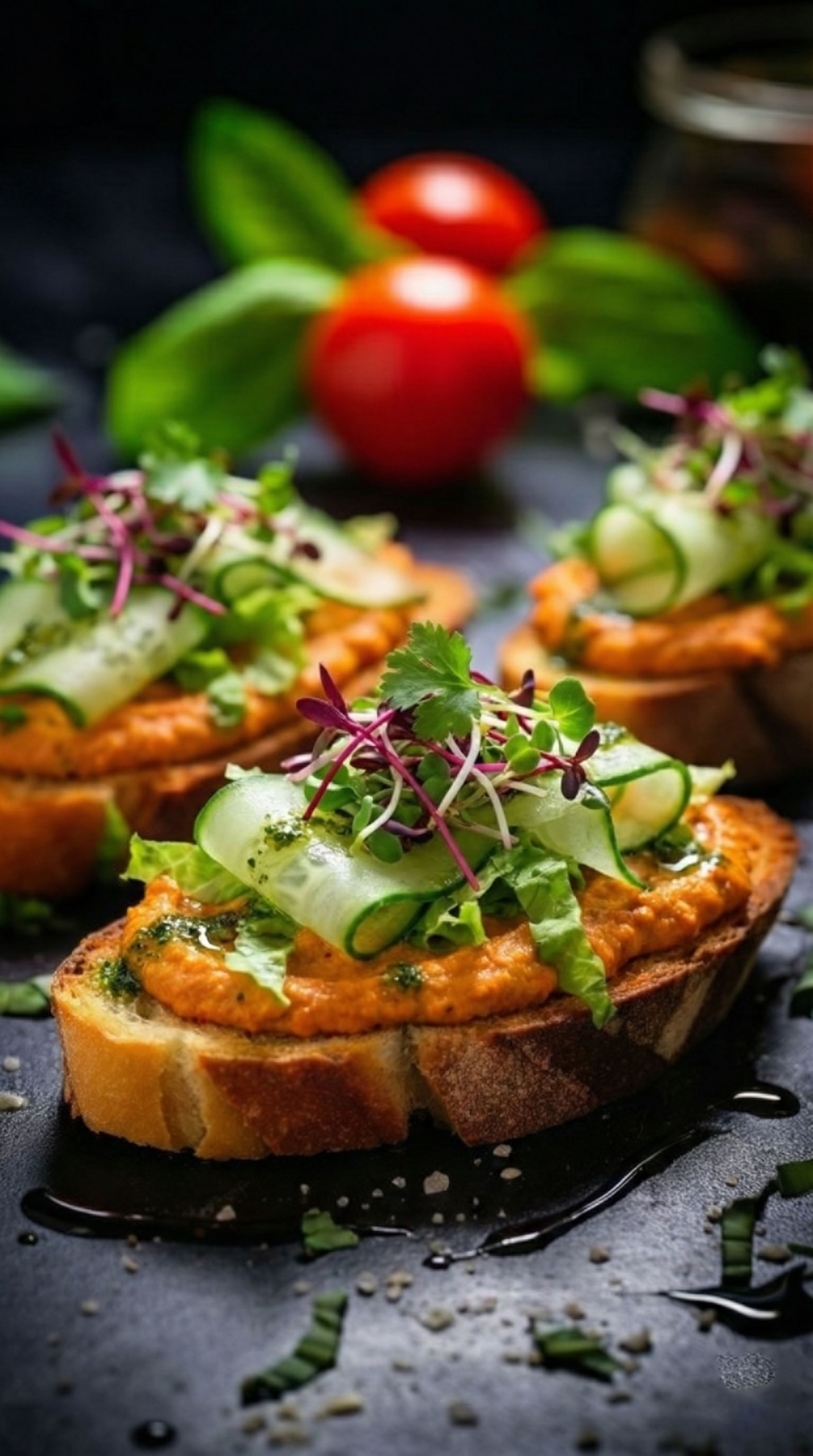 Crostini herbal oil, Spicy chipotle hummus , cucumber shaves,