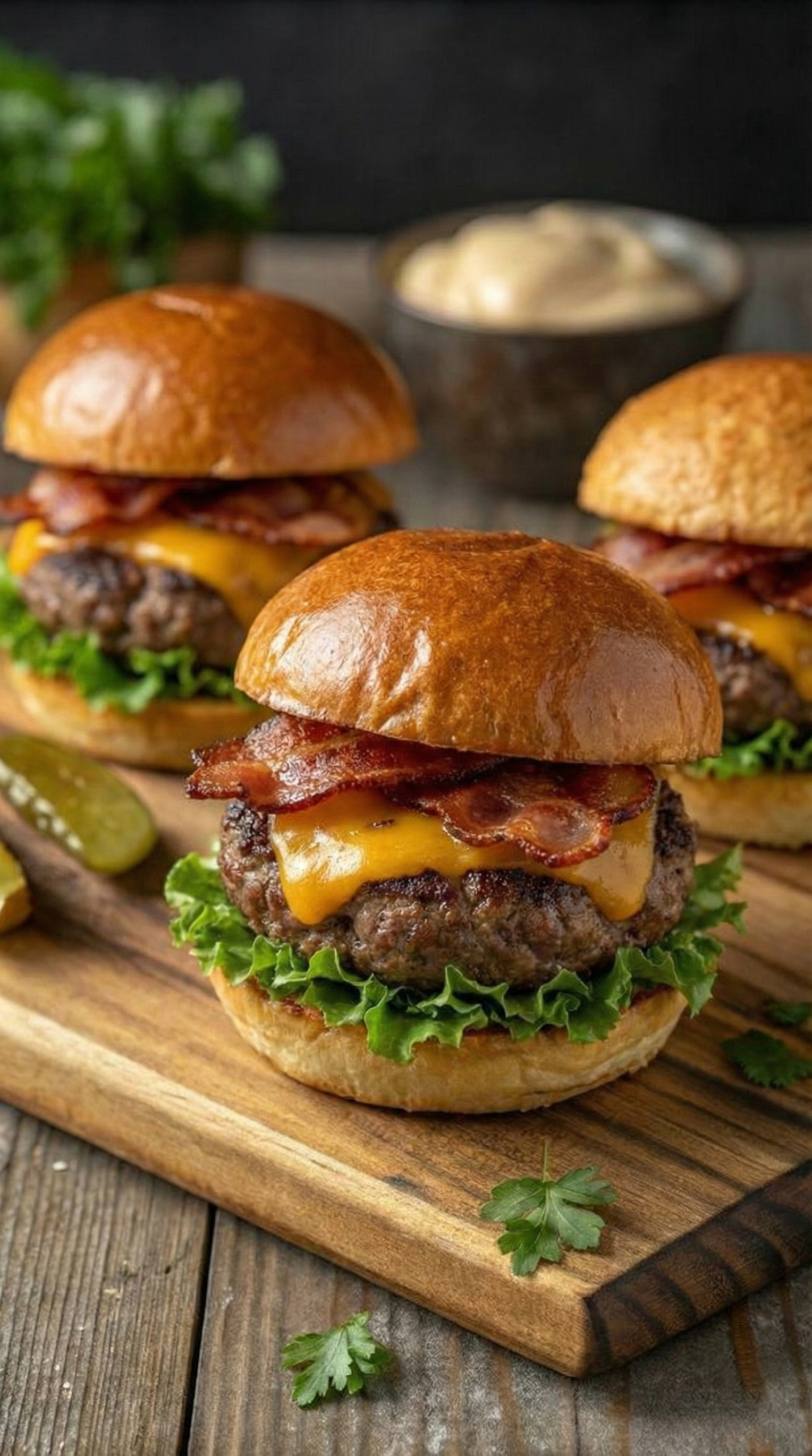 Mini Angus beef burger with flavored brioche bun, crispy beef bacon, lettuce, smoked red cheddar cheese