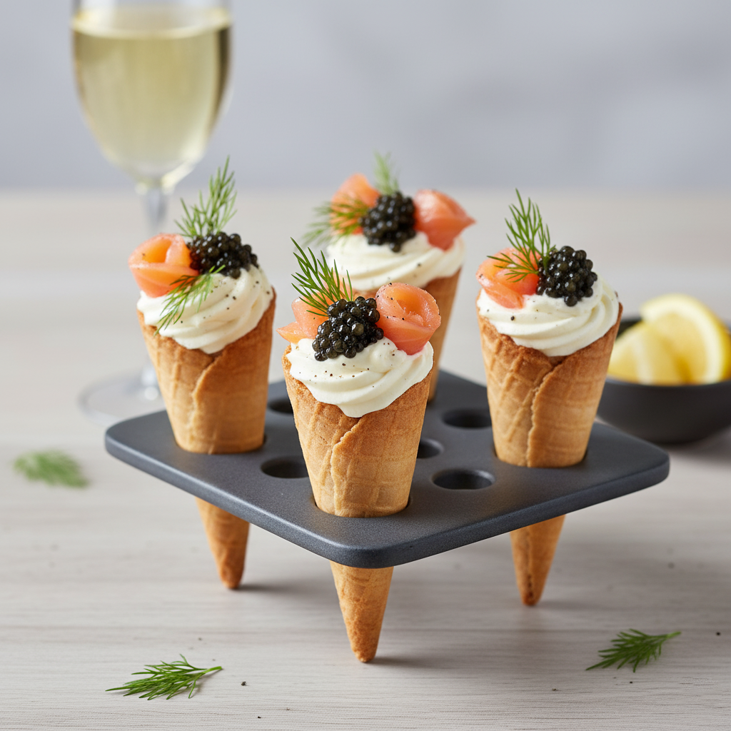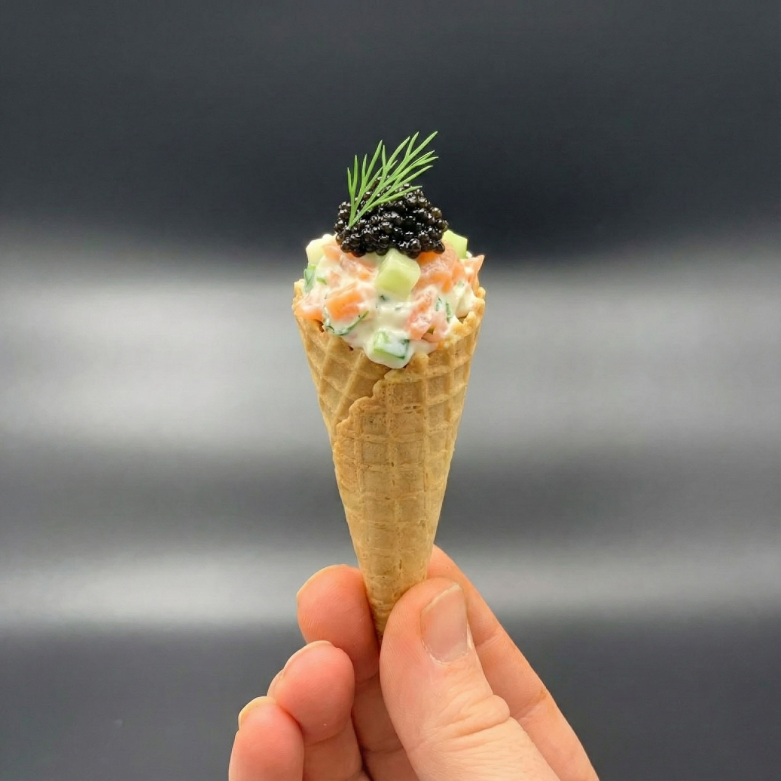 Mini Cone filled with lemon cream cheese, salmon, caviar and dill