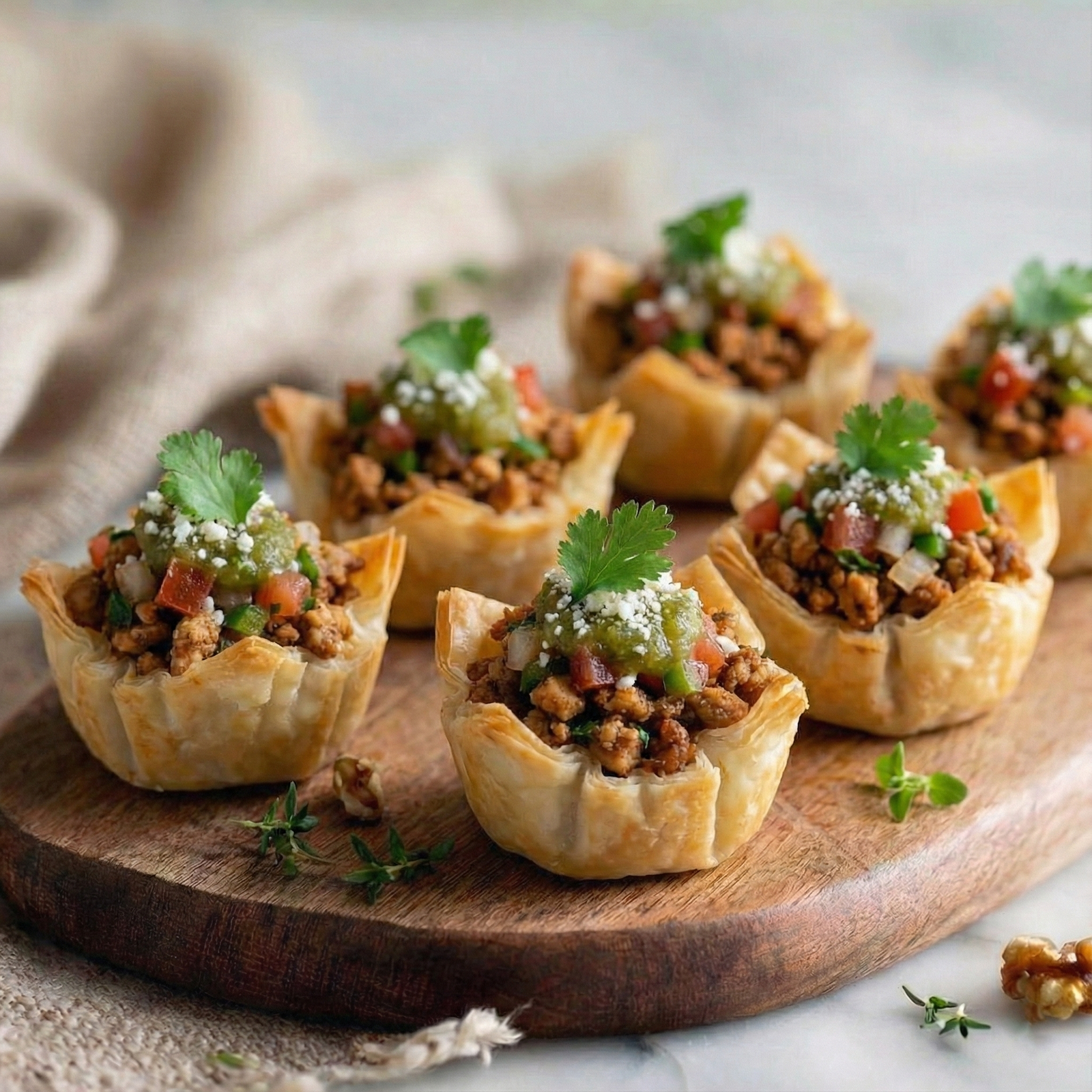 Mini filo florets cups Filled with minced chicken and Mexican salsa