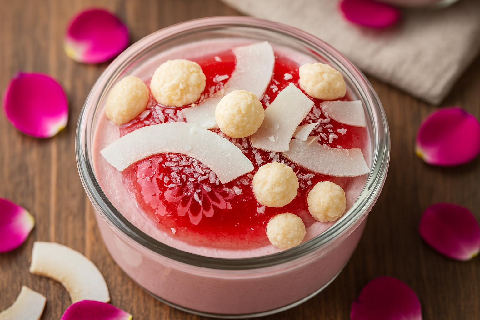 Mini Rose water vanilla pudding, topped with Rose gel, coconut shaves and Shiny sweet puffs