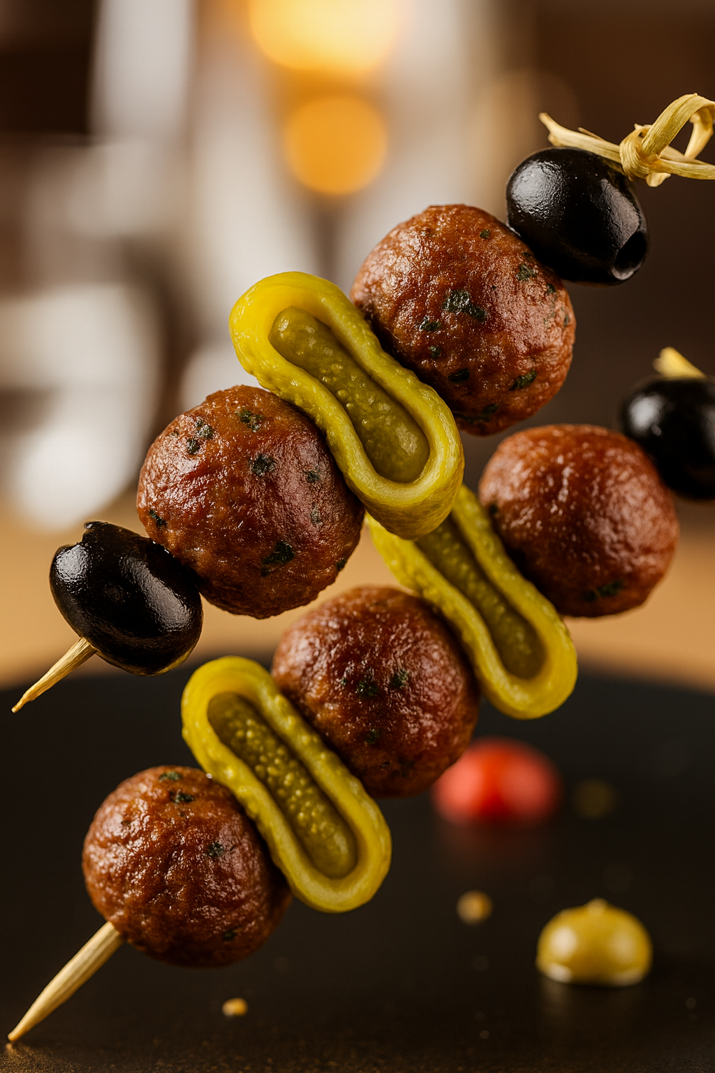 Mini skewer of juicy meat balls, cornichons & olives