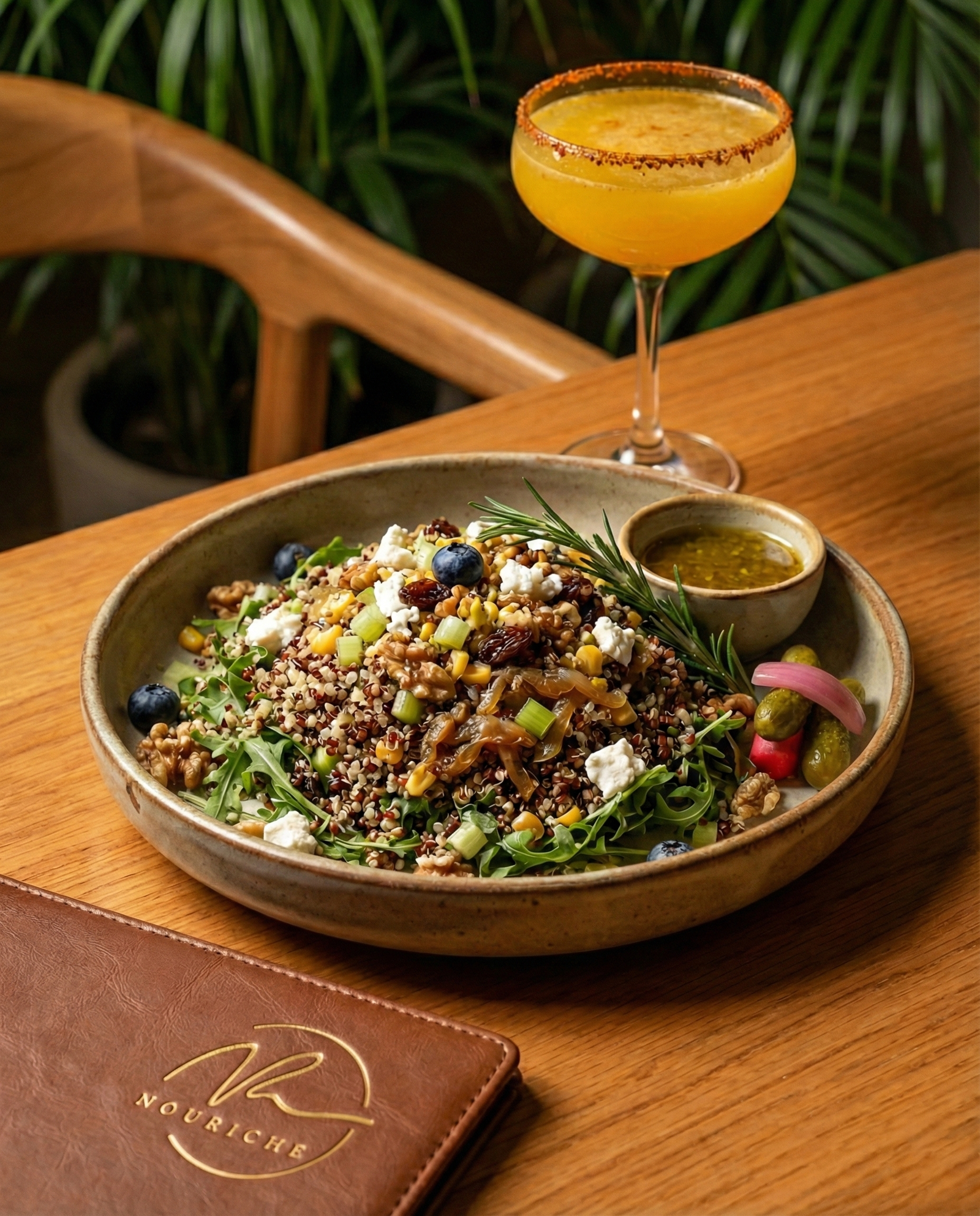 Mixed colors Quinoa salad, walnuts, raisins, crumbled feta cheese, arugula, celery, corn, caramelized onions, blue berries & herbal dressing ( 10 bowls of 300 gm)