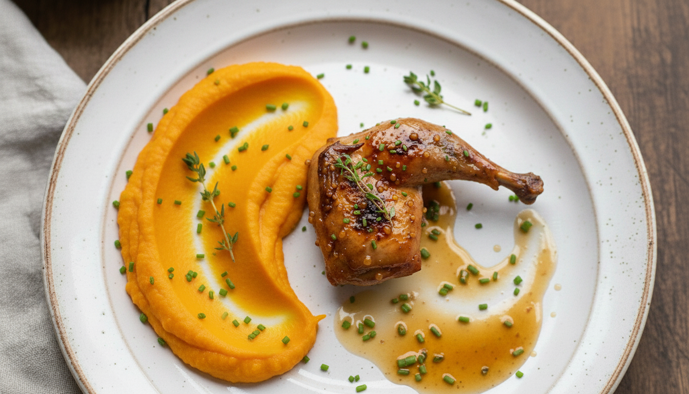 Roasted half Quail in Homemade glaze sauce and sweet potatoes puree
