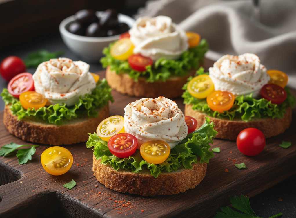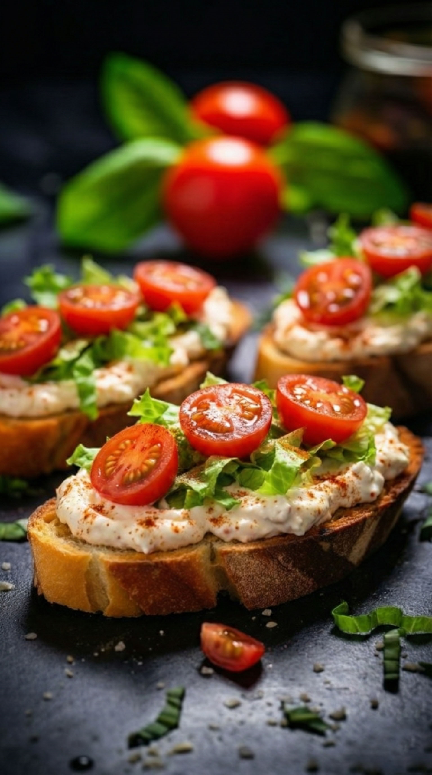 Sliced baguette ,Smoke d paprika Feta cheese cream, lettuce, half cherry Tomatoes